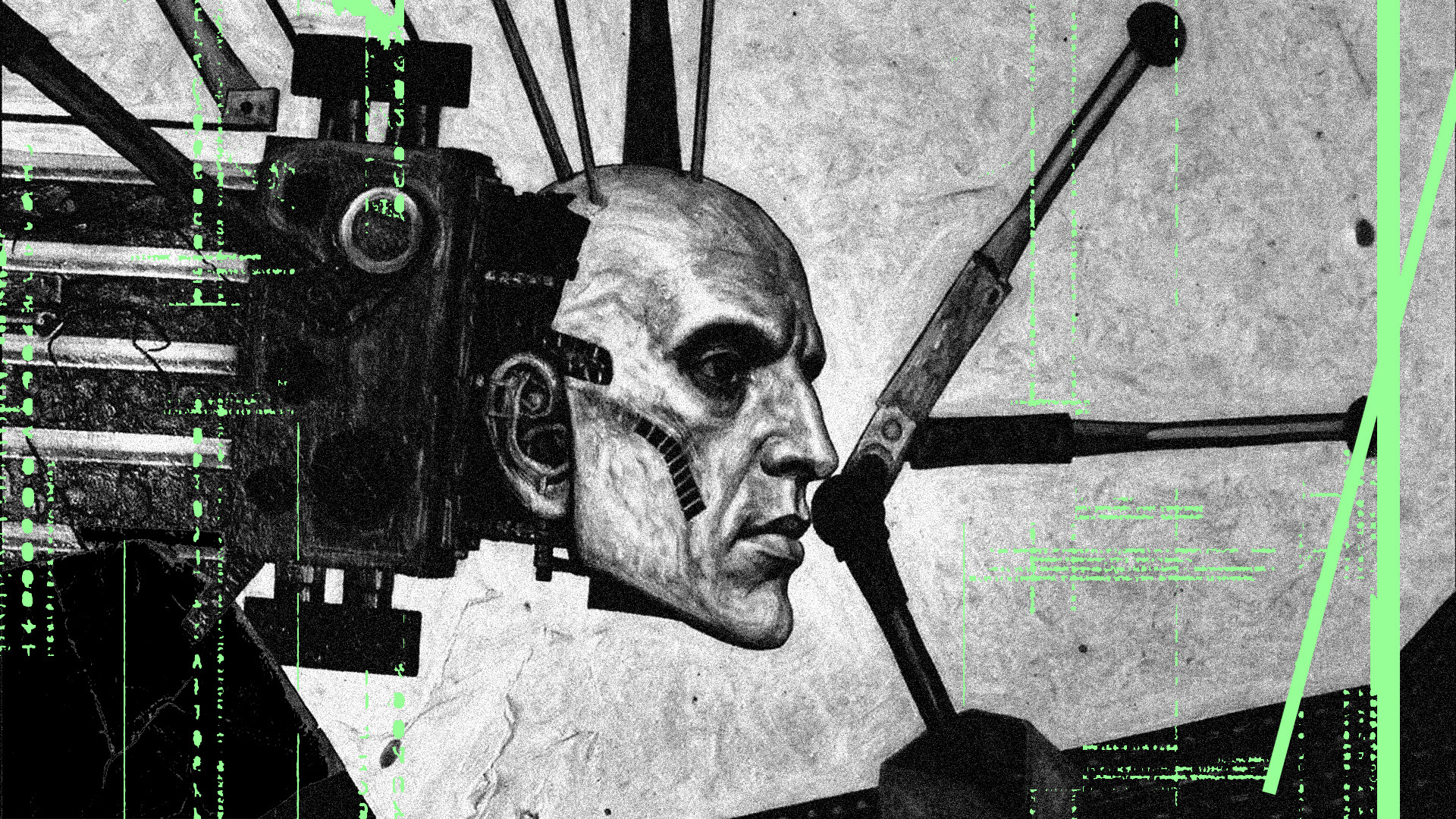 A series of graphics complements the video essay, visualising its main themes: power, darkness and the fusion of man and technology. Each image exudes an atmosphere of anxiety and dystopia, showing the consequences of technology's interference with the body and mind. Together, the video essay and graphics create a coherent picture of a disturbing future dominated by technology and power.